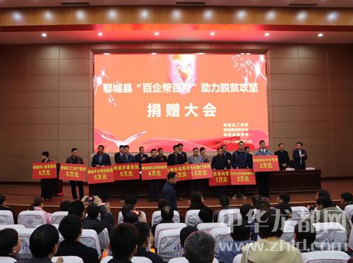 中华龙都网讯(周口报业全媒体记者 徐松 文/图)4月13日,郸城县召开“百企帮百村”助力脱贫攻坚捐赠大会,全县129家企业反哺社会助力脱贫攻坚,现场捐赠近1300万元。郸城县四个班子领导、部分县处级领导干部、县慈善会会长、县扶贫协会会长、县直各单位和乡镇负责人等参加捐赠大会。县委书记罗文阁发表讲话,县长李全林主持会议。
