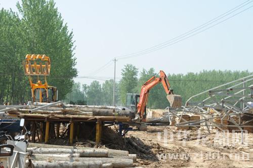 中华龙都网讯(周口报业全媒体记者 张劲松 通讯员 苏千 文/图)4月18日,东新区城管中心在该区国土局、许湾乡政府的配合下,出动执法人员120多名,执法车辆10辆,对许湾乡程寺行政村6处违法占地、违章建设进行强制拆除。