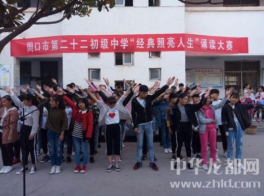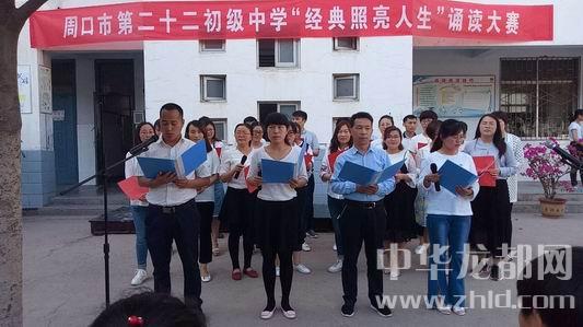 中华龙都网讯(周口报业全媒体记者 李帅)5月9日下午,周口市第二十二初级中学校全体师生在教学楼前举行了2018“经典照亮人生”诵读大赛,副校长王文斌和语文组老师出席活动并担任了大赛评委。