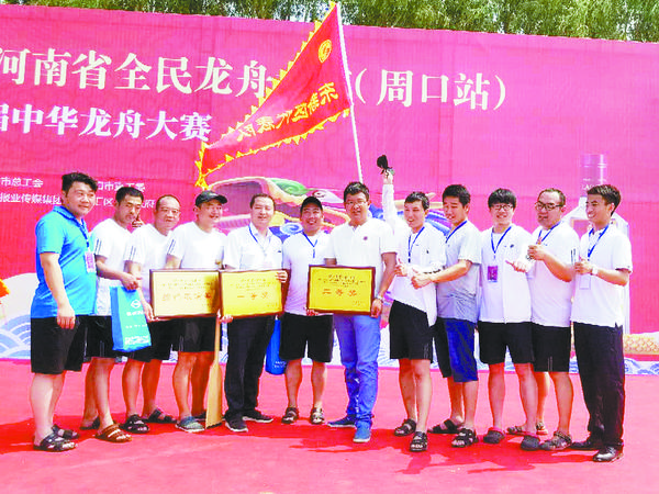 中华龙都网讯 (周口报业全媒体记者 张劲松 文/图) 在6月17日举行的周口市第五届中华龙舟大赛中,东新区代表队共拿下三项大奖,分别是市直组200米竞速赛一等奖、市直组300米竞速赛二等奖和捕鸭表演奖(如图)。
