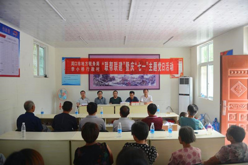 中华龙都网讯(周口报业全媒体记者 马治卫 通讯员 苏童)为喜庆中国共产党建党97周年,夯实贫困村基层组织基础,促进脱贫攻坚工作深入开展,按照中共周口市委组织部和周口市直工委要求,6月26日上午,周口市地税局组织相关科室负责人走进帮扶村太康县王集乡李小村行政村开展“党建联帮联建暨庆七一主题党日”活动。这是该局在帮扶村“两委”成功换届之后第一次举办主题党日活动,市、县、乡各级领导及驻村工作队和帮扶村30余名党员代表参加了此次活动。