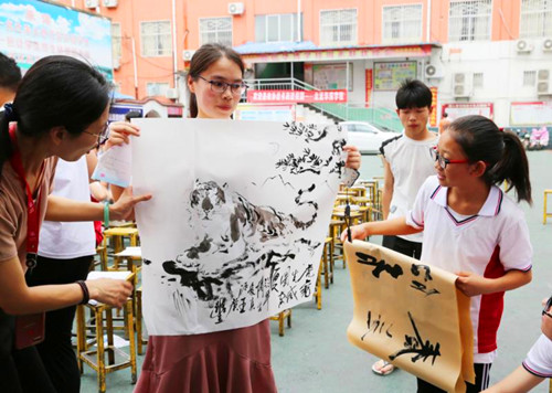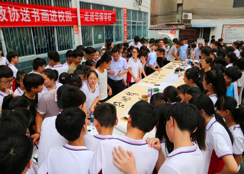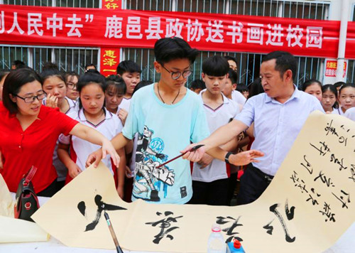 中华龙都网讯(周口报业全媒体记者 李瑞才 通讯员 孙广合 胡洪涛)6月26日上午,鹿邑县政协和县文联联合开展“到人民中去”送书画进校园活动,组织10余位知名书画家走进校园,现场挥毫泼墨,为师生义写字画。
