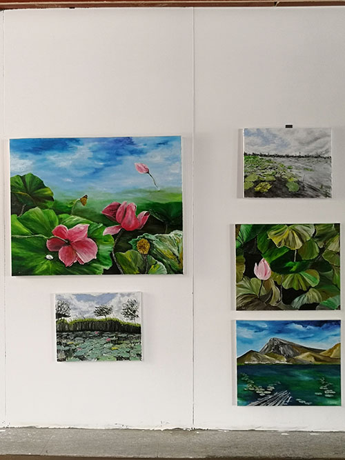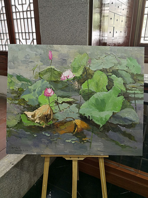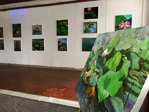 在龙湖荷花盛开的季节,女诗人油画家三色堇、娜仁琪琪格、爱斐儿、暖玉、白芳芳、刘文文一行6人,来到周口进行写生观摩,开展老庄文化交流、伏羲太极文化传播等公益活动。7月17日上午开展女诗人油画家写生作品展,丰富多样的活动成为淮阳荷花节一浓墨重彩的一笔。