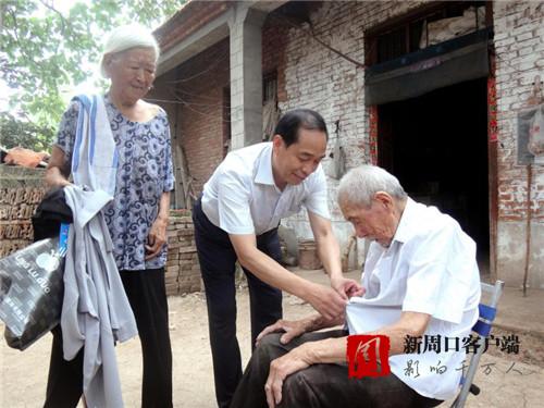 张吉志主任带头捐款1000多元购买6套衣裤、拖鞋送到6位贫困老人手中。