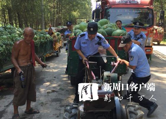 三伏天里,西瓜是不可或缺的消暑水果,但一些瓜农在出售西瓜时却往往忽视了交通秩序,因车辆停放不当造成交通拥堵。扶沟县公安局江村派出所民警冒着酷暑,加强辖区西瓜市场巡逻,及时疏导拥堵路段交通。图为7月18日,民警正在疏导西瓜市场拥堵车辆。
