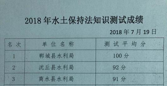 7月20日,一份周口市“2018水土保持法知识测试成绩单”传到郸城县水利局,该局以100分的优异成绩荣获全市第一名。