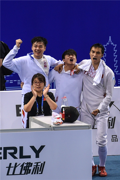 7月25日,在江苏省无锡市举行的2018世界击剑锦标赛男子重剑团体赛16进8的比赛中,中国队以45∶36战胜乌克兰队,晋级八强。