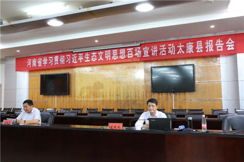 7月26日,河南省学习贯彻习近平生态文明思想百场宣讲活动太康县报告会在县综合楼会议室举行。省委宣讲团成员、省委宣传部理论教育讲师团调研员曾琰珉主讲,太康县委书记王国玺主持并与该县四个班子领导及副处级以上干部和县乡两级负责同志及相关人员共同聆听了报告。