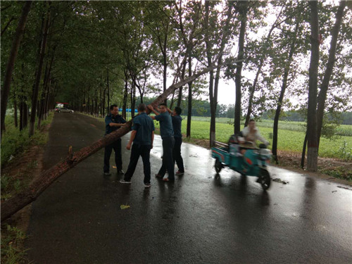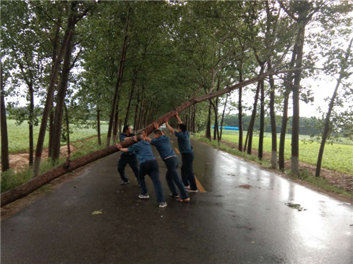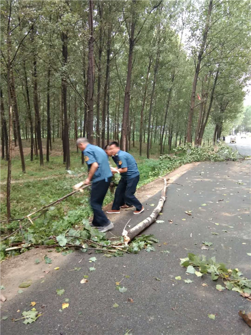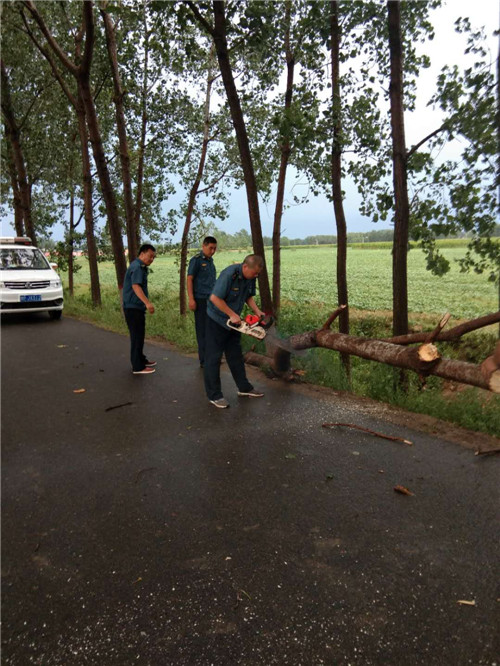 在东夏看张立交桥、李庄桥处,多棵行道树被大风刮倒,大量枝掉落在公路上,严重危及行车安全和道路通行,执法人员立即冒雨采取安全防护措施,并利用车载应急抢险工具将倒塌在公路上直径为10-20cm的树木进行及时清理,并对残枝落叶进行了全面清扫。历时三个小时,及时地消除了道路安全隐患,保障人民群众的出行安全。