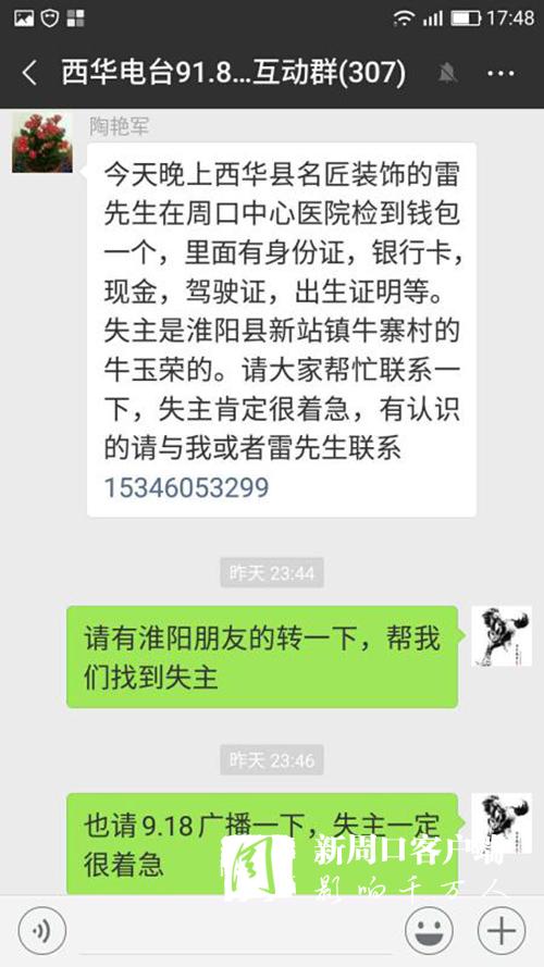 很快,一条寻找失主的爱心信息,便通过无线网络,乘着夜色翅膀,在豫东大地的西华县政协群、西华县非公党工委群、西华县城市管理群、西华县爱心粥屋群、西华电台91.8互动群、周口市个私协会系统群、淮阳县非公党工委群、淮阳县文明办群、淮阳县城市管理群等微信群迅速散发开来。很多群友进行转发、点赞。