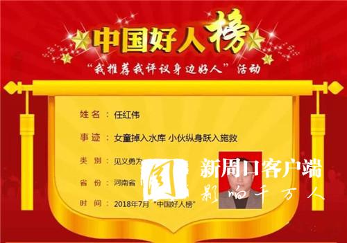7月30日,中央文明办全国道德模范与身边好人现场交流活动在长春举行,现场发布了7月“中国好人榜”,太康县任红伟光荣入选7月份见义勇为类中国好人榜。目前,太康县入选中国好人榜人数已达39人。