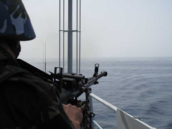 “哒哒哒……”,特战队员扣动扳机,重机枪发出猛烈的怒吼,呼啸而出的子弹在海盗快艇前筑起一道难以逾越的火线,海盗见状,顿时慌了手脚,急忙调转船头,仓皇逃窜。