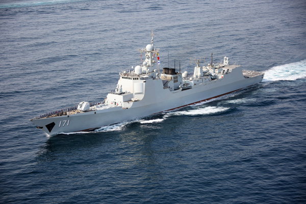 2009年1月19日下午4点45分左右,海口舰在护航过程中与法国F730“花月”号护卫舰在亚丁湾西部海域不期而遇。法舰主动向海口舰打出灯光信号,通报舷号。随后,法舰调整航向,与海口舰同向航行。当两舰舰首对齐时,“花月”舰向海口舰鸣笛致敬,同时,“花月”舰上法国军官向海口舰举手敬礼。法舰舰长还电台表示,他们正在返回母港吉布提途中,法军官兵非常欣赏中国海军现代化驱逐舰,特向中国护航官兵致意。