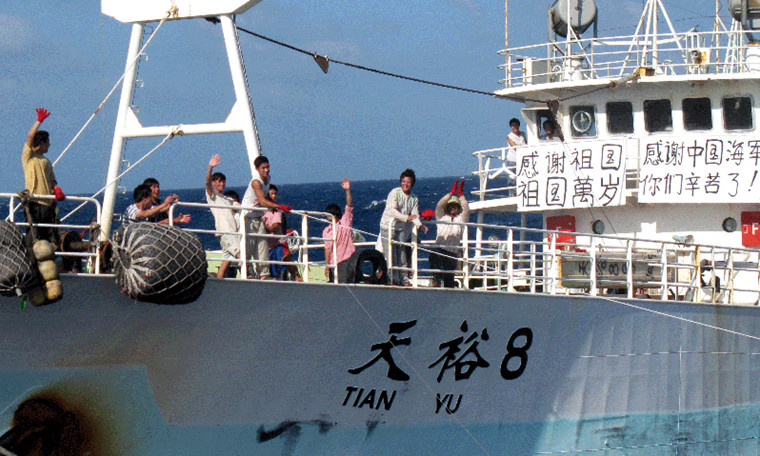 看到海口舰,“天裕8号”船员就像见到了久违的亲人,纷纷走上甲板,欢呼着向海口舰挥手致意,并在船上升起一面鲜艳的五星红旗。他们年龄大约在二十岁左右,在甲板上行走如飞,如履平地一般。