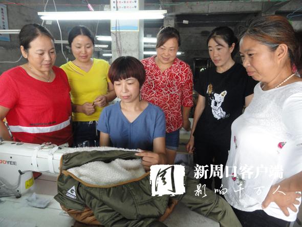 商水县人大代表郭梅花在巴村镇政府及相关部门的帮助下,创办了华宸服装有限公司,每年安排120名留守妇女就业,人均月收入3000多元。图为郭梅花为新入厂的贫困留守妇女指导制衣技术。乔连军 摄
