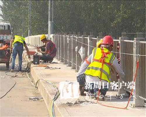 近日,记者在周口大道沙颍河大 桥施工现场看到,顶着37度高温,施工人员正在进行新栏杆的更换等工作。据工程施工方河南省大成建设工程有限公司项目商务经理李宝胤介绍,大桥改造将在桥梁两侧各加宽九米,加上拱形钢结构造型。“目前已拆除了旧栏杆,安装上新的不锈钢栏杆,在桥面人行道上铺装了石材,并对桥栏杆两侧及桥体两侧实施亮化工程,预计8月底前完工,而后再陆续进行桥梁加宽工程。”