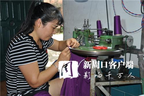 今年以来,商水县实施精准扶贫,大力发展服装代加工,让不能外出打工的贫困群众从工厂领回设备和原材料在家加工,厂方上门进行技术指导并回收成品。图为该县巴村镇董村村民使用厂方提供的毛衣编织机在家加工羊毛衫。