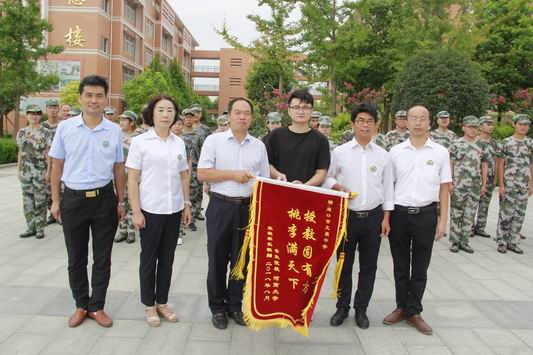 8月16日上午,周口市文昌中学毕业学子张毅再次走进母校,把一面锦旗送到级部主任杨留杰和班主任王建军手中,诚挚地表达了对老师和母校的感恩之情。
