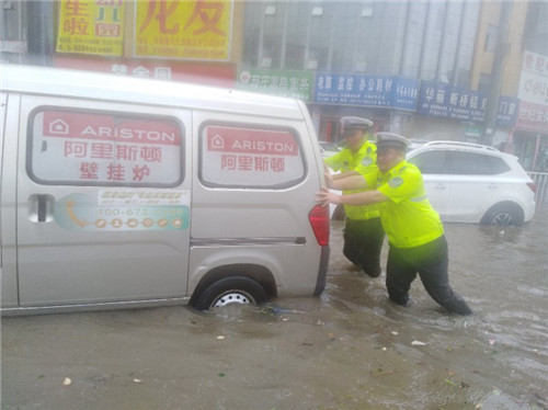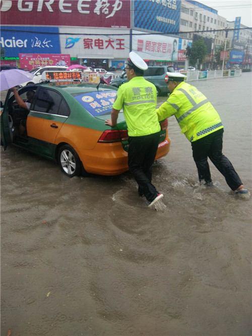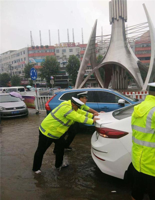 8月18日,郸城县暴雨持续,城区部分街道积水,给过往的群众造成不便。为使行人和车辆有序安全通行,郸城交警冒着暴雨在水中指挥交通,在积水较深的路口交警干脆脱掉鞋袜赤脚站在水中执勤,感动了过往路人。
