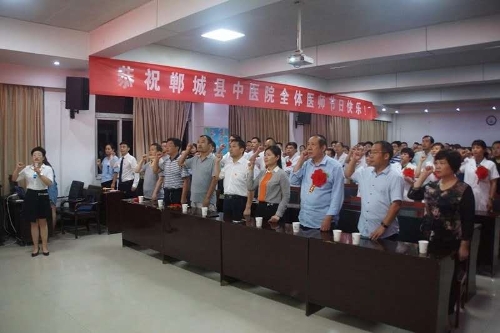在郸城县中医院医务部主任肖俭的带领下,中医院的医师们庄重地举起右拳,庄严地宣誓,决心严格遵守誓言,时刻以中国医师宣言为激励,以自身的实际行动践行誓言,忠诚于医疗卫生事业,全心全意为人民健康服务,恪守医德、团结合作、精益求精,做人类健康的卫士。