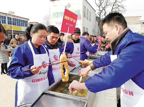 为了让更多的人利用炸油条走上致富路,邓城镇从2012年开始,每年定期举办炸油条大赛,或者是技能培训,请到一些炸油条的大师或者面点专家,免费提供技能培训,给想学炸油条的人搭建一个平台。这个活动也成了当地最为盛大的美食节。目前,炸油条大赛已经举办了6届,参加的人数不断增加,比赛的代表队从刚开始的十几个增加到30个。