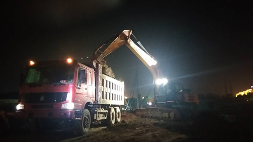 在德和家园施工现场,虽近22时,挖掘机依然挥舞着铁臂在不停地挖土,渣土车来来往往地运送着土方,静谧的夜空在德和家园的施工现场也躁动起来。