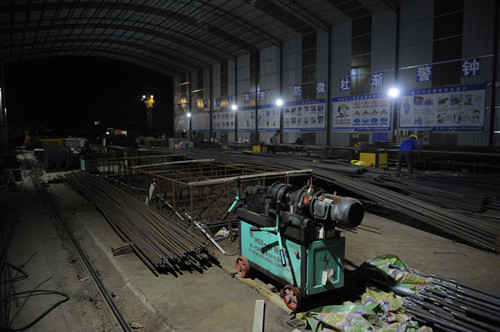 当晚21时许,记者在泰和家园施工现场看到,钢筋加工棚的工人们正在进行钢筋的切割,他们在为明天施工准备钢筋材料。A1#楼正在进行垫层的浇筑工作,A8#楼正在进行负一层及周边地库的钢筋绑扎及模板加固工作,A9#楼正在进行负一层墙柱钢筋及模板内架搭设工作。现场2台钢筋切割机在不停地运转,9台塔吊在持续工作,40余名施工人员在场地内各司其职,紧张而有序地赶进度,整个施工现场如火如荼。