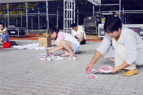 图③:几名工作人员正在地上整理号码贴。