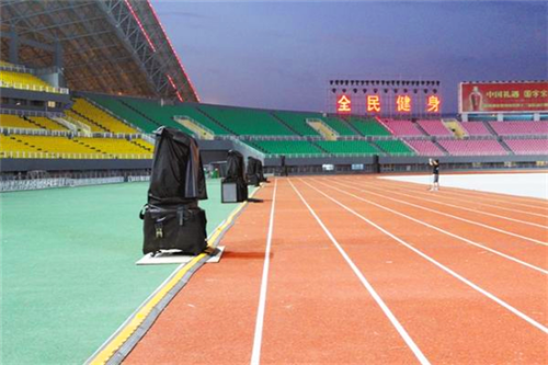 图①:跑道边上音响整齐排列。