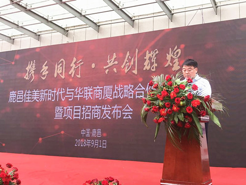 9月1日上午,佳美新时代与华联商厦签约暨招商推介会在鹿邑县华联商厦举行。县领导陆志杰、张勇、曹玉娟,原县政协主席、县慈善会领导鲍远光出席签约仪式。佳美新时代地处鹿邑商务中心区黄金商圈,由河南佳美商贸有限公司与华联集团强强联合,300多家知名企业商户共襄盛举,共同打造集休闲、娱乐、餐饮、体验、购物、旅游等功能于一体的5万平方米商业综合体项目。