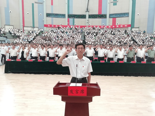 “不忘初心、牢记使命………争分夺秒、苦干实干,坚决打赢脱贫攻坚战!”随着县委书记马明超领誓,与会的约4000名干部集体庄严宣誓。县委副书记、县长王毅主持大会。