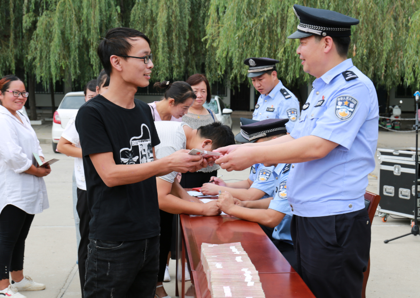 9月6日,扶沟县公安局举行公开退赃大会,将“2·28”诈骗案追缴的56万元现金返还给受骗群众。