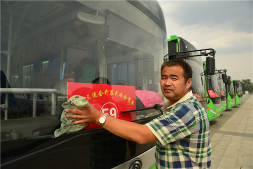 随着省第十三届运动会开幕式临近,近日,市公交总公司接送演职人员的公交车已经增至近百辆,这些公交车的司机每天都要工作到午夜2时许。据悉,从今年4月份省运会先期比赛项目开赛以来,市公交总公司已为省运会出动公交车2800台班,中心城区公交候车亭提升改造工程也正在快速推进中。图为市公交二公司的刘师傅利用闲暇时间擦车。②5记者 梁照曾 摄
