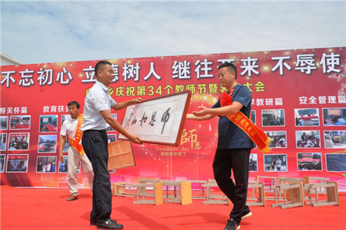 9月6日,虎岗乡庆祝第34个教师节表彰大会在贫困村后赵行政村文化广场召开,旨在激励更多人尊师重教、扶贫扶智。王忠朴向县书法协会汇报情况之后,县政协副主席王岩、书协主席巴云山等10多名全县知名书法人士,联合为虎岗乡获奖师生书写了32幅书法作品,内容为“师恩如山”“教书育人”“尊师重教”“月朗清风”等励志名言,王忠朴负责装裱,以便于获赠者悬挂和收藏。