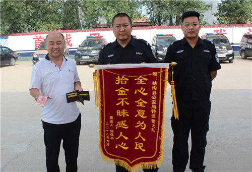 9月10日,刘先生将一面印有“全心全意为人民,拾金不昧感人心”的锦旗送到扶沟县公安局特巡警大队,专程向该大队辅警方松致谢。