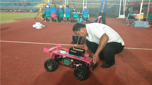 9月16日晚,在省十三运会青少年竞技组田径比赛的铁饼赛场上,一辆运送铁饼的红色“遥控小汽车”特别引人关注,它来回奔波在赛场之上,主要任务帮助运动员运送铁饼。“这辆小汽车的名字叫投掷器材运输车,专门用来运送投掷器械的。在铁饼、标枪、链球这些长投项目中,由于器械投出的距离较远,所以用遥控小车来代替人运送这些器械。田径运动会场地上的小遥控车是用来运送投掷器械的。”场地边一位工作人员介绍。