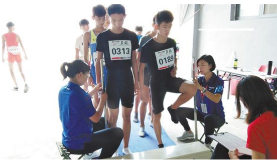 9月15日上午,在省十三运会青少年竞技组田径比赛赛场旁,运动员正在进行量身高、测体重等一系列综合素质测评。
