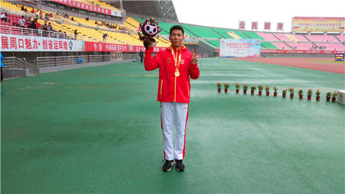 9月17日上午,在省十三运会青少年竞技组田径比赛少年男甲400米决赛中,周口队选手孙泽豪在起跑落后情况下,奋力直追,夺得该项目金牌。