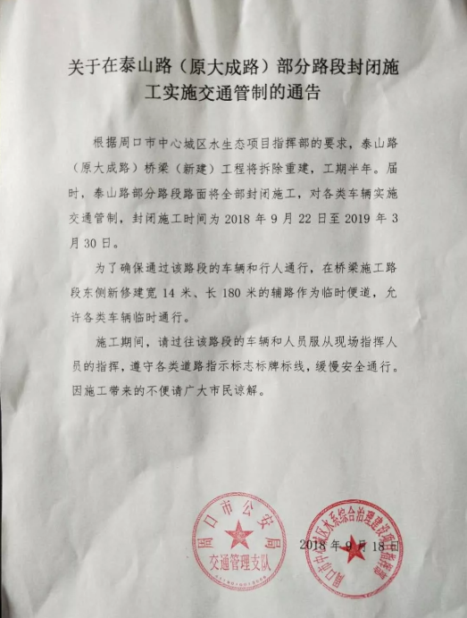 根据周口市中心城区水生态项目指挥部的要求,泰山路(原大成路)桥梁(新建)工程将拆除重建,工期半年。届时,泰山路部分路段路面将全部封闭施工,对各类车辆实施交通管制,封闭施工时间为2018年9月22日至2019年3月30日。