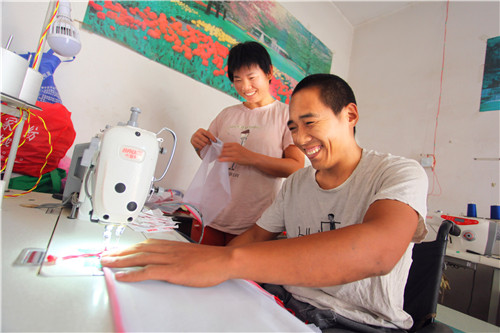 生意闲的时候,朱建舟又和妻子商量,借钱购买了两台缝纫机,帮助附近一家工厂加工环保袋。加工活虽然不累,但对于双腿残疾的朱建舟来说却很困难。一向爱动脑筋的朱建舟自己动手把缝纫机踏板改装成手动式的,大大提高了工作效率。“一个月能挣2000多元钱,还能顾家,照顾病人和孩子。”王五妮心里有说不出的高兴。