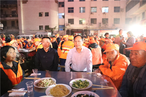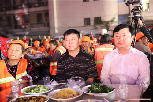 记者在公益活动现场看到,偌大的院子坐满了环卫工人,8人一桌,桌子上已摆好饮料和碗筷。一旁,周口市副市长张广东和数十名身穿通络止痛药酒的志愿者一起,正忙碌着为环卫工端茶送菜。“老乡,多吃点,有啥意见我们提提。”张广东每到一处,都不忘俯下身子与环卫工亲切交谈几句。