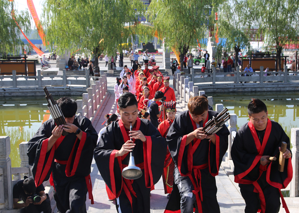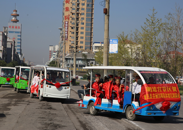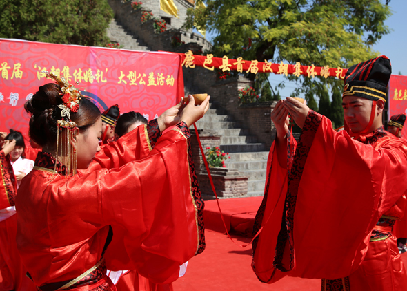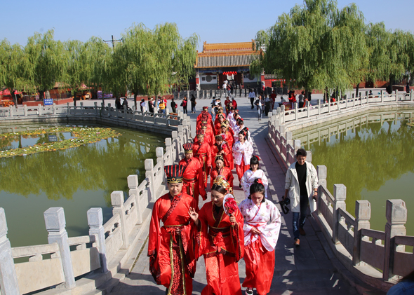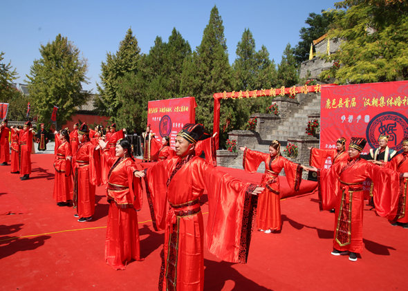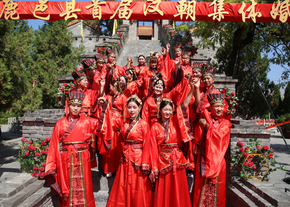 9月29日上午,鹿邑县首届“汉朝集体婚礼”在老子故里明道宫景区举行。10对新人在明道宫升仙台脚下举行集体婚典,圆了自己的“汉代婚礼”梦。