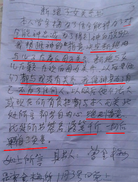这是一封“全能神”信徒写给家人的《断绝子女关系书》。从中可以看出,受毒害的“全能神”信徒曾金梅为了表达对“全能神”忠诚,决定断绝与3个子女的母子关系,并表示信神是为了自己,不为了任何人,同时保证:此处所言,都出自内心,绝无悔意。此处所书签名,落笔千金,一切后果我自己负责。
