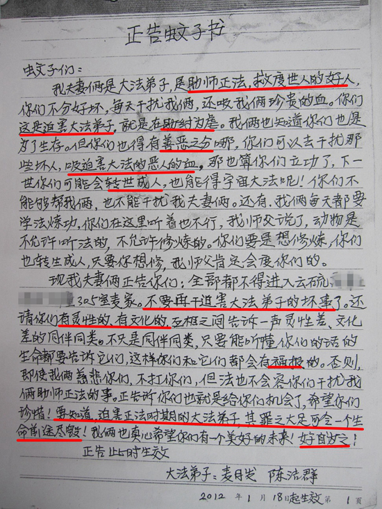 2012年1-2月,广东省云浮市“法轮功”痴迷人员麦月发(男,69岁)、陈洁群(女,63岁)夫妇连续发出《正告蚊子书》、《正告蟑螂书》、《正告老鼠书》、《与睡美宝、睡眠之宝、椰海蚊帐沟通》,抗议蚊子、蟑螂、老鼠干扰其修炼“法轮大法”。没有最荒唐,只有更荒唐。以《正告蚊子书》为例,夫妻俩指控蚊子们这是迫害大法弟子,就是在助纣为虐,其罪之大足可令一个生命前途尽毁!为挽救这些不知好歹的生命,夫妻俩还郑重其事地给它们指点了一条“生路”——去“干扰那些坏人”,这样将来会得到师父的“福报”和“救度”,有机会“转世成人”,还能得“宇宙大法”。