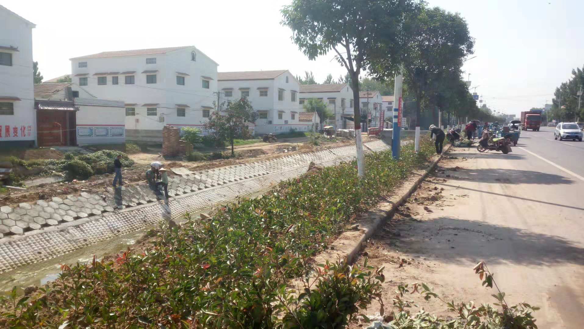 吉鸿昌将军纪念馆的文化提质项目现场,游客接待中心已经完工,正在进行外墙清洗;新修建的停车场已具雏形,周边绿化施工正在紧张进行中。汽车行进在县城至永登高速的连接线上,透过车窗望去,只见白墙红瓦的两层小楼整齐排列,掩映在绿树丛中;用六边形石砖新砌的马村干渠河床内,清澈的水在静静流淌;道路两侧,枝繁叶茂的行道树刷白的树干与新栽的大叶黄杨、石楠等绿植交相辉映,好一幅美丽如画的乡村风情!“所有的绿化施工今天就可以全部完工,接下来马上进行道路清洗,保证不拖全县百城提质的后腿。”项目负责人向张颖波一行汇报工程进展情况时信心满满。