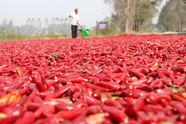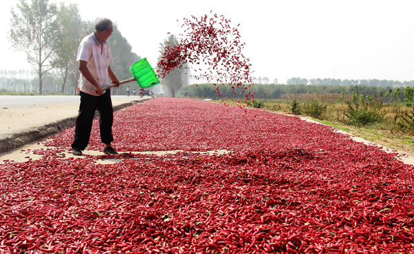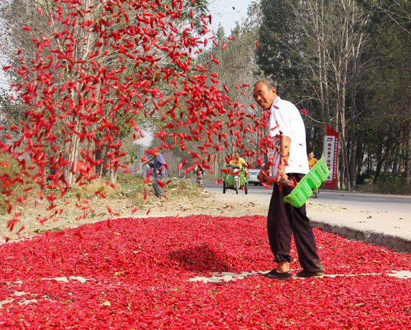近年来,商水县郝岗镇大力实施辣椒产业扶贫,通过党员干部带动、结对贫困户扶持发展,种植万亩以上小辣椒,实现亩效益3000元以上,促进了群众增收致富。图为昨日上午,该镇西洄行政村农民正在晾晒小辣椒。