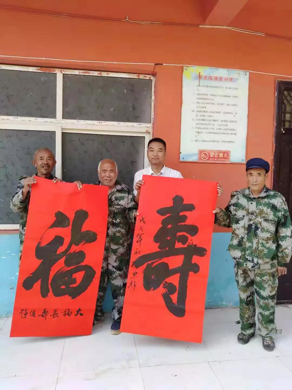 王忠朴(左三)为敬老院的老人送“福”“寿”