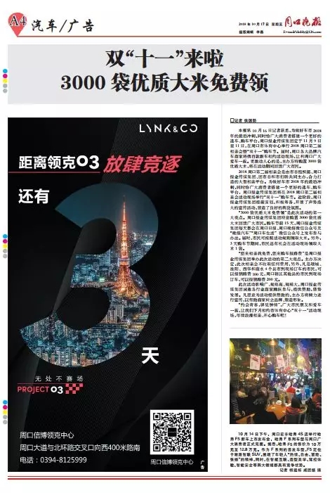 周口报业传媒集团定于11月9日至11日,在周口市体育中心举行2018周口第二届相亲会暨“双十一”购车节。届时,周口各大品牌汽车商家将携百款新车相约活动现场,让利周口广大爱车一族。更激动人心的是,主办方特购置3000袋优质大米,将在活动期间回馈广大市民。