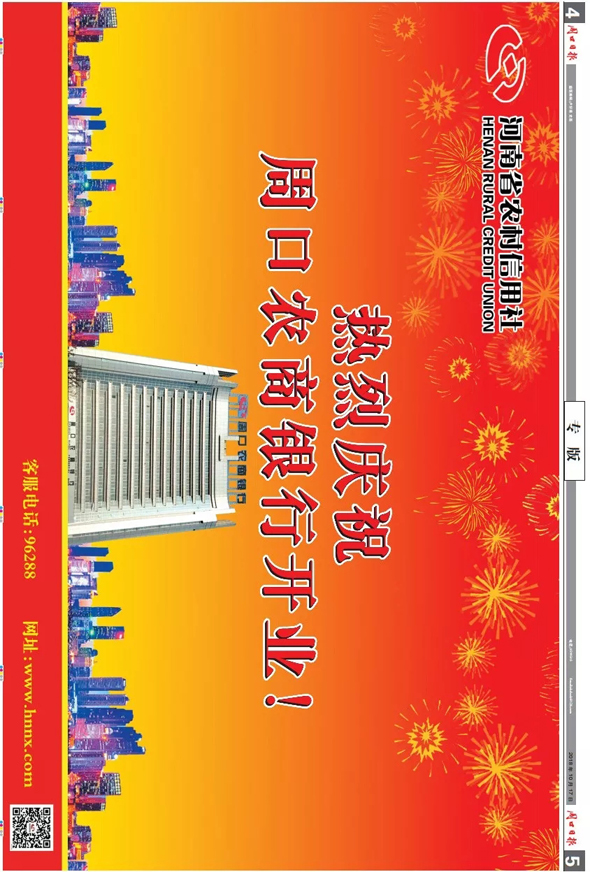 今天的《周口日报》4、5版,通版3000多个平方厘米的广告,周口农商银行真是大手笔!