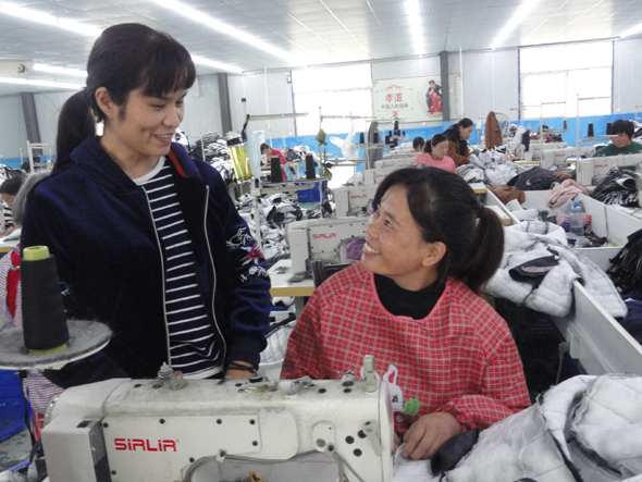 10月20日,商水县黄寨镇草楼村“返乡创业标兵”、镇人大代表梁艳丽(左)向留守妇女李霞了解生产情况。5年前,梁艳丽和丈夫田新田从温州打工返乡后在镇人大、工商联和扶贫办的帮助下投资200万元创建巧姑制衣有限公司,下设3个制衣厂和1个扶贫车间,安排当地300多名留守妇女和30名贫困户妇女就业。